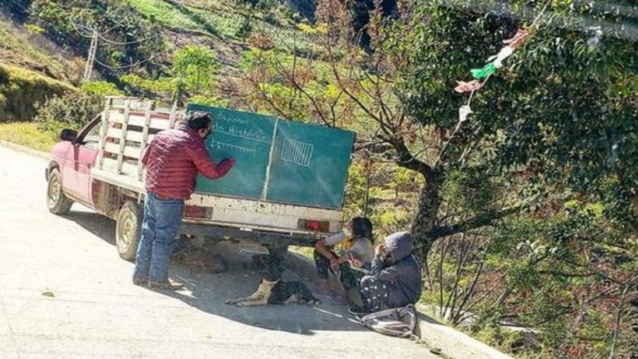 El profe “Chava” como lo conocen en el municipio de Pinal de Amoles, en la Sierra Gorda de Querétaro, decidió instalar un pizarrón en la parte posterior de su camioneta y comenzó a recorrer las comunidades de aquel municipio del norte de la entidad para que sus alumnos no se quedaran sin tomar clases.