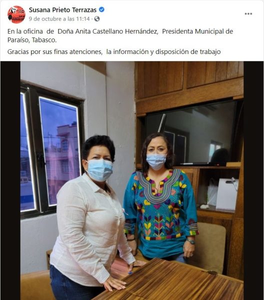 Este fin de semana la diputada federal de Morena, Susana Prieto Terrazas (originaria de Chihuahua) estuvo de gira en territorio tabasqueño, su visita se centró en el municipio de Paraíso, lugar donde se realizan los trabajos de la refinería de Dos Bocas y al que llegó con la promesa de desterrar a los sindicatos que ahí proliferan.