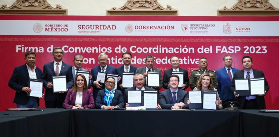 La Secretaría de Seguridad y Protección Ciudadana, llevó a cabo la firma de convenios de coordinación del Fondo de Aportaciones para la Seguridad Pública (FASP) 2023 con diez entidades federativas del norte del país, el objetivo, mejorar la estrategia conjunta en la materia y lograr la paz en beneficio de las y los ciudadanos.